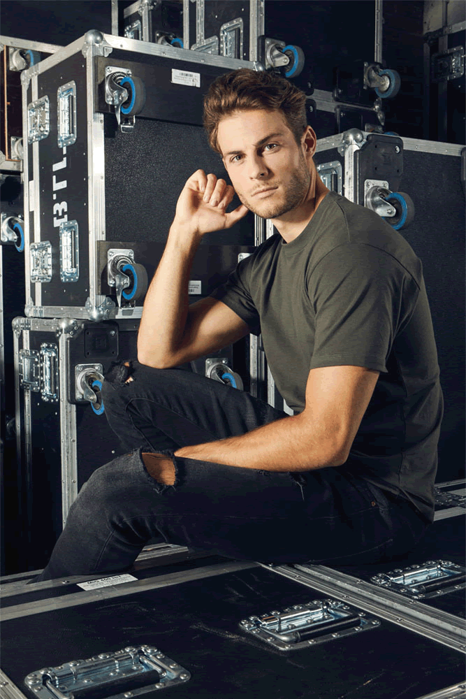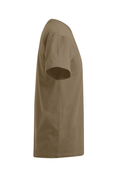 Classic mixed fabric single jersey T-Shirt with elastane in small rib neckline, produced of combed cotton with polyester. The T-Shirt has a modern cut and is made with side seams.