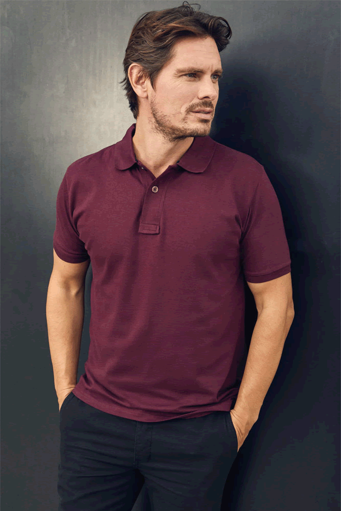 Timeless single jersey polo with button panel and 2 tone-in-tone buttons, shortened sleeves with cuffs and side slits, produced of combed cotton. The polo has a modern cut.