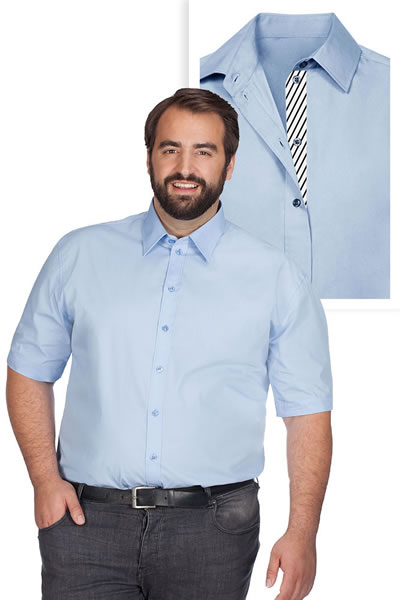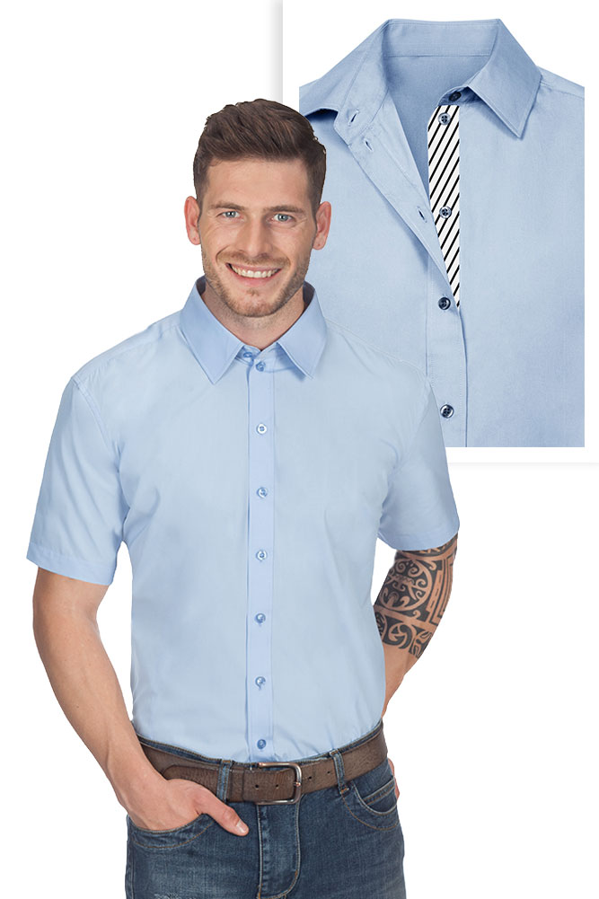 Short sleeve shirt, high-quality finished button panel, design: Stripes narrow, kent-collar, double back yoke, curved hem, neutral size label, separate chest pocket, classic cut, easy-care mixed fabric, poplin, easy care finishing, wash 60° C, spare button, 55% cotton, 45% polyester, 120g/m², S-5XL. Single packing.