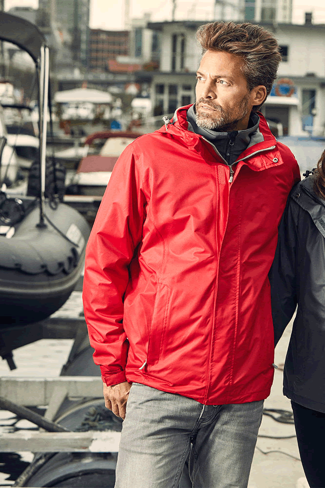 Jacket, stand-up-collar, concealed 2-way zip plus velcro fasteners, removable hood with volume regulator in the front and the back, concealed napoleon pocket with zip, adjustable sleeve cuffs with velcro fastener, tunnel drawstring at hem with cord stoppers inside, 2 side pockets with zip, invisible zip for decoration, zip and fixing for changeable inner jacket, neutral size label, printable area inside for branding, taped seams, PU coated, waterproof 5.000 mm, windproof, breathable 5.000 g/m²/24h, outer material 100 % polyester, inner material (mesh/taffeta lining ) 100 % polyester, S–5XL.