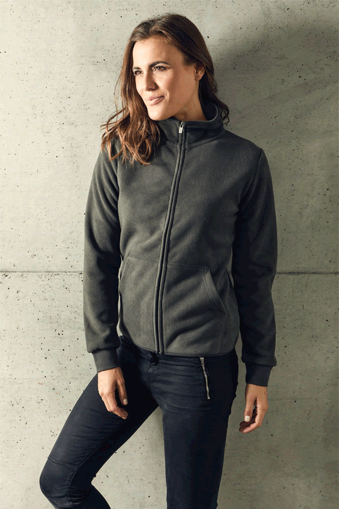 Double fleece jacket with stand-up collar and fulllength zipper, sleeve cuffs with elastane as well as slit pockets with decorative stitching. The inside of the jacket is in contrast colour, produced of polyester with