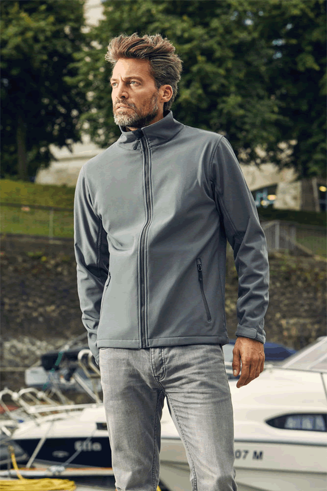 Softshell jacket. The specific features of this jacket: zip with rain and chin protection, adjustable sleeve cuffs with velcro fasteners, tunnel drawstring at hem with cord stoppers inside, 2 side pockets with zip, fixing for outer jacket, breathable, waterproof 8.000 mm, produced of bi-elastic bonded fleece from polyester with elastane for better comfort. The jacket has a sporty cut.