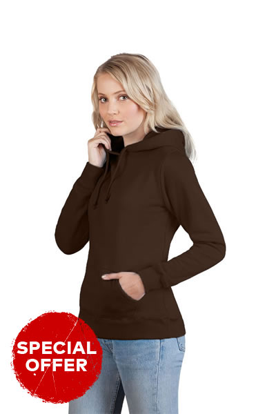 Sweatshirt, pouch pocket, double hood with lining, elastane sleeve cuffs and waistband, mixed fabric, molton brushed, 80 % cotton, 20 % polyester, 280 g/m², XS–XXXL.